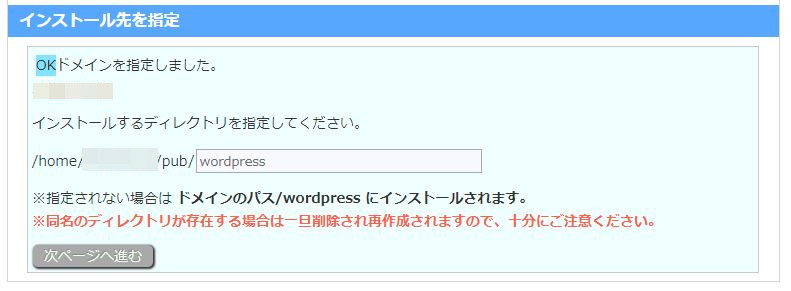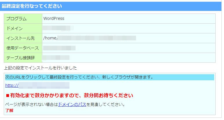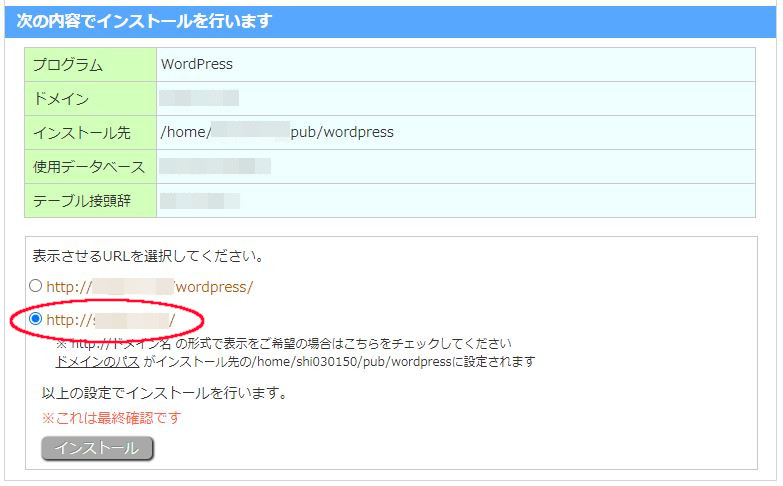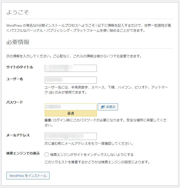 メールアドレス ・・・任意のアドレスを設定します。 以上を設定したら、WordPressをインストールのボタンを押します。